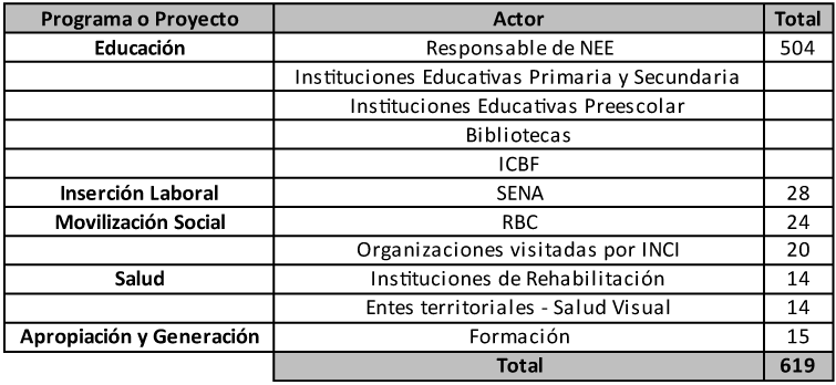 En relación con la priorización de regiones a las que se va a realizar la visita, se seleccionará a conveniencia en términos de su rol dentro de las acciones y las redes de relaciones identificadas en el ejercicio de la ciudadanía de las personas con limitaciones visuales, teniendo en cuenta el nivel de apropiación y participación en los procesos desarrollados por el INCI. En estas visitas se desarrollan encuentros y entrevistas con los actores territoriales, complementando la información en las técnicas anteriormente descritas; y buscando reconocer: